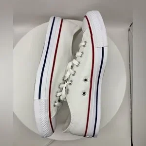 Classic and timeless, these Converse Chuck Taylor All Star low tops feature the iconic white canvas upper with red and blue stripe accents. A unisex favorite that pairs effortlessly with any outfit.