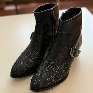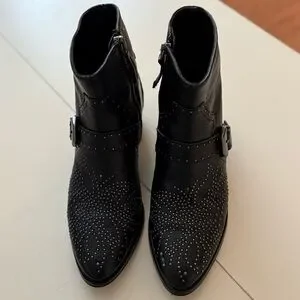 ZARA Black Leather Studded Western Ankle Boots Biker Rock Goth Grunge Booties