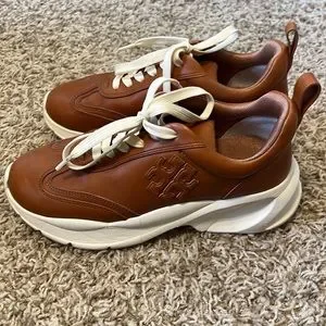 Stylish Tory Burch sneakers. Rich brown leather with cream laces. Comfortable and chic design.