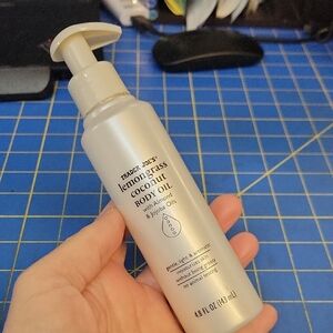 Trader Joe's Lemongrass Coconut Body Oil with almond and jojoba oils. Perfect for moisturizing and soothing skin.