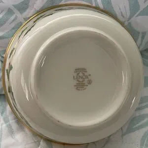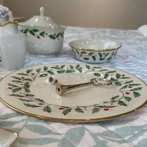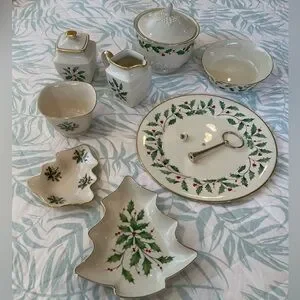 Beautiful Lenox Holiday 8 Piece set with intricate holly design. Ideal for festive occasions. Items can be used as holiday decor or to add festive beauty to your holiday table setting.