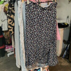Chic floral midi skirt. Features a navy base with white and red floral pattern. Ruffled hem adds elegance. Perfect for any occasion.