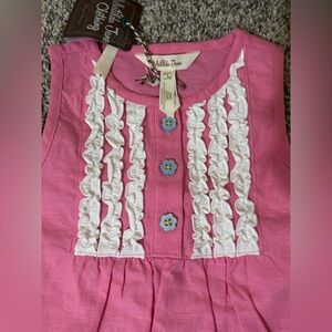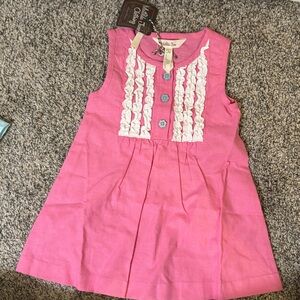 Charming pink dress with white lace ruffles. Features blue button accents. Ideal for casual outings.