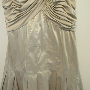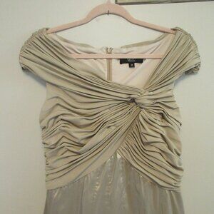 Elegant cream maxi dress by Tadashi Shoji. Features ruched bodice and flowing skirt. Perfect for formal occasions.