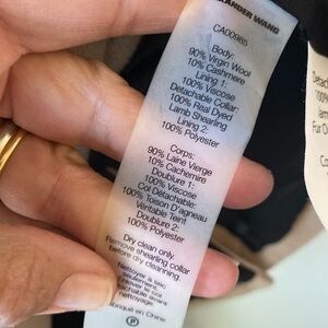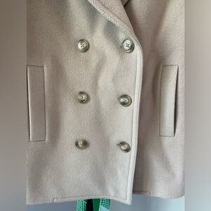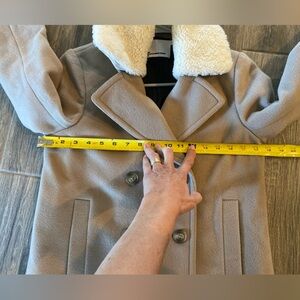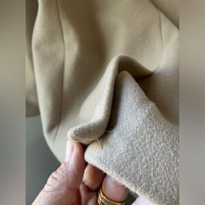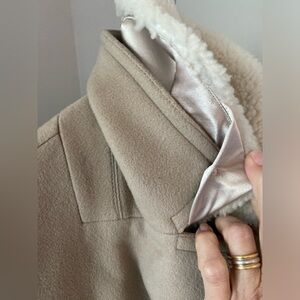 Previously owned but never worn. Removable lamb shearling fur collar from Australia. Great neutral color, pockets, still sewn shut. Lined with viscose. Body 90% wool and 10% cashmere! Beautiful well made coat.