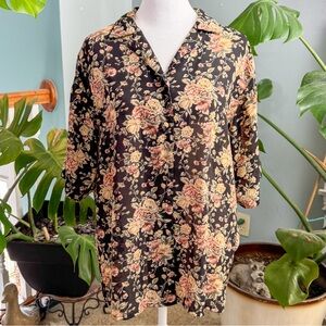 black floral print, sheer blouse, vintage 90s, button down shirt, boho chic, floral motif, lightweight fabric, gothic vibe, layered style, casual elegance
