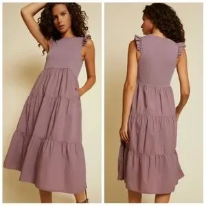 The Sissy Dress from Nation Ltd is a mixed-media delight. This easy-to-wear silhouette has feminine ruffle sleeves with a tiered poplin midi skirt. Wear this with leather sandals or Golden Goose sneakers, or throw on a jacket and boots for cooler weather!
