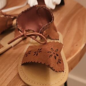 Charming tan sandals with floral cut-outs. Easy slip-on style. Ideal for summer fun. Nwot size 6M