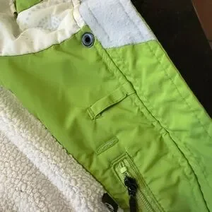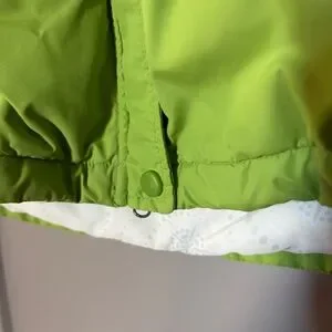 Columbia Insulated hooded winter jacket with a bright green outer shell and white accent panels on the chest and sleeves. The jacket is often described as fleece-lined or insulated and is designed to be warm. Full-zip front with a hood, zippered pockets, and white accent panels across the chest and down the sleeves. FLeece or sherpa lining, which helps to provide warmth. FeatureS Omni-Heat thermal-reflective technology. This technology uses a reflective lining to retain body heat and provide warmth without adding bulk.