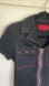 Chic black dress with bold red stitching. Features zip-up front and and silver accents on the front and back. Shoulder also has a zipper accent.