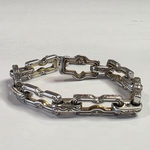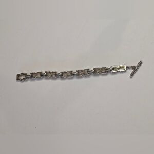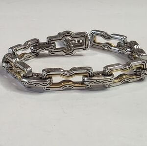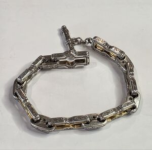 Keywords: silver bracelet, link bracelet, toggle clasp, two tone jewelry, designer bracelet, statement bracelet, elegant, sophisticated, everyday wear, evening wear, bold jewelry, chunky bracelet, women's accessory