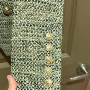Chic tweed blazer with double-breasted design. Features elegant gold buttons. Perfect for a polished look. In great condition. Worn two or three times.
