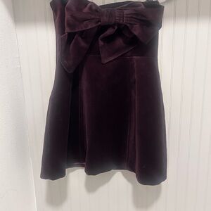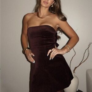 Elegant strapless mini dress in rich chocolate. Features a large bow accent at the back.