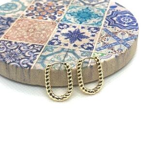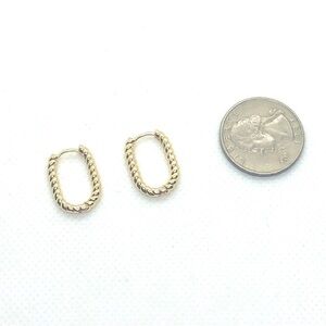 Pictured above is a beautiful pair of new 14K gold plated twisted rope u-shaped huggie hoop earrings with a hinged clasp. These are the perfect size for everyday wear and easy to add to any earscape paired with studs or other hoops!