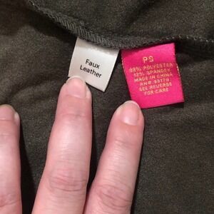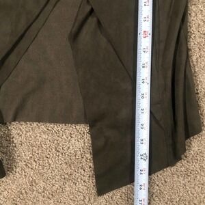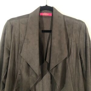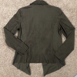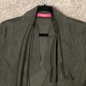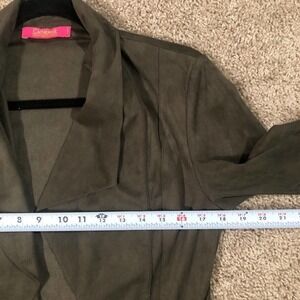 Pictured above is a gorgeous Catherine Malandrino Olive Green Faux Suede Open Layered Cascade Waterfall Jacket in petite small.