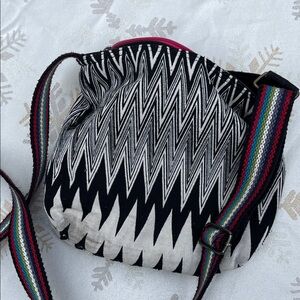 Add a splash of color to your outfit with this vibrant crossbody bag. Perfect for any occasion, it features a unique artistic design.