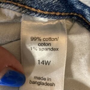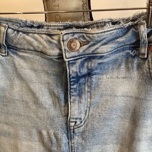 Maurice’s distressed stone washed raw hem jean skirt, size 14W, good used condition, has small stretched area near zipper as shown in pics