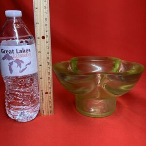 Vintage MCM Glass Bowl / Pedestal / Heavy / Green Clover / Iridescent / Flaw