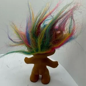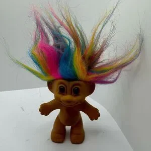 - Bright multicolored “up-combed” hair and classic troll-face expression (see hair condition in photos)