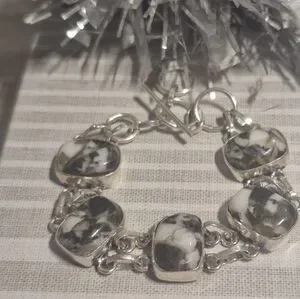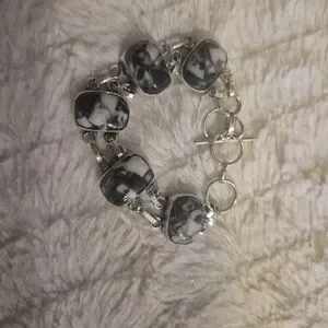 This elegant black and white buffalo turquoise stone bracelet features striking black and silver stones, perfect for adding a touch of sophistication to any outfit. Its unique design makes it a statement piece in any jewelry collection.