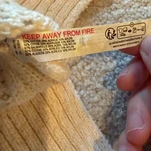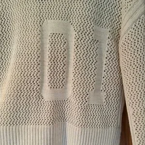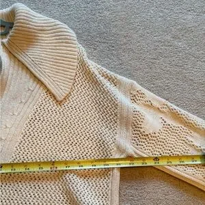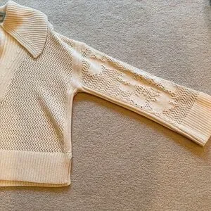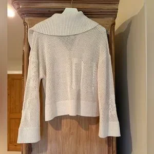 This ivory pullover is super comfortable. Only worn once and in great condition. Silver hardware with designs on the left sleeve and back. Size medium. I live in smoke-free/pet-free home.