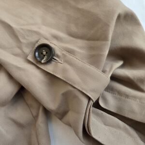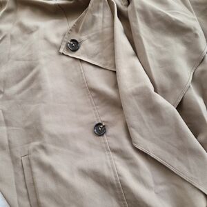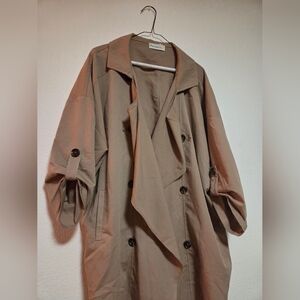 Elevate your style with this chic tan trench coat. Perfect for any occasion, this coat offers both comfort and elegance. Loose fitting trench coat from boutique. Fits like L/XL