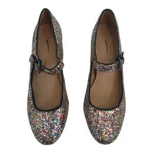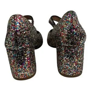The Madewell Size 7.5 The Zelda Mary Jane Block Heel in Glitter is a stylish pump designed for parties and cocktails. This multicolor heel features a round toe, buckle closure, and a block heel style. Made of glitter fabric with accents of glitter, this shoe is perfect for adding a touch of glamour to any outfit. Perfect for women looking for a fashionable and eye-catching footwear option for special occasions.