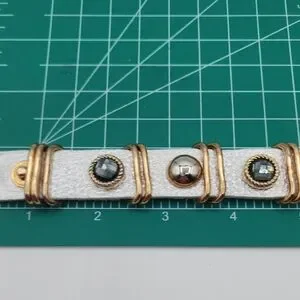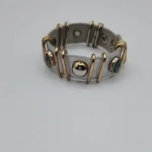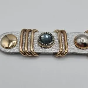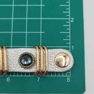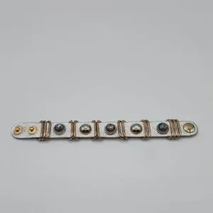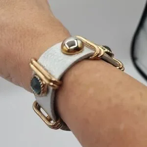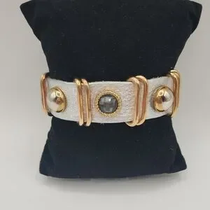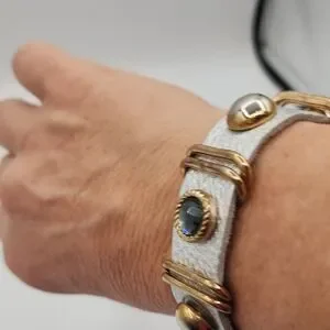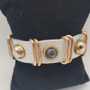 This stunning bracelet features a sophisticated blend of gold and silver tones, perfect for adding a touch of elegance to any outfit. The intricate design and high-quality materials make it a must-have accessory. Pre-owned in good condition.