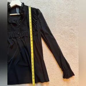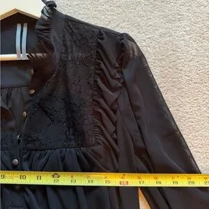 This black top is beautiful. The sleeves are sheer while the torso is lined, and the fabric falls beautifully. Very pretty on and easy to wear. Size medium. I live in a smoke-free/pet-free home.