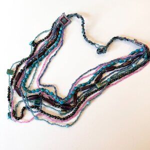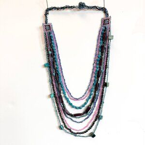 Beautiful multi-stranded beaded necklace, hand made in Indonesia. Turquoise and blue colored beads in various sizes, with deep and light violet colored beads also. A strand of black beads for contrast. Drapes beautifully, total length of shortest measurement is 21". 25014M