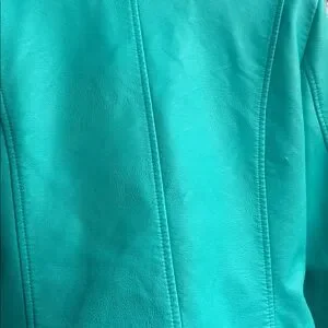 This is the Levi's women's faux leather moto jacket in teal color-used once for a photoshoot-in great condition, size Small. It has two small scuffs on the right side of the back, hard to notice when the jacket is worn. This jacket features a classic biker-style design with a laydown collar and snap lapels, an asymmetrical front zipper closure, and multiple zippered pockets. The color is described as teal or turquoise. This style of jacket is considered a wardrobe staple, and is made of water-resistant polyurethane material. 100% polyester.