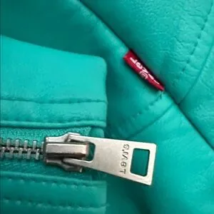 Chic Levi's leather jacket in vibrant turquoise. Perfect for a bold, stylish look.