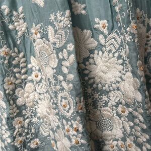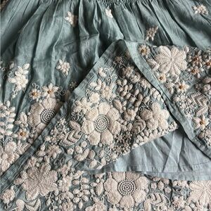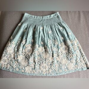 Anthropology embroidered skirt pale blue cream flowers wooden beads embellishment size 2 full skirt