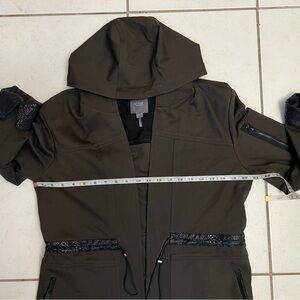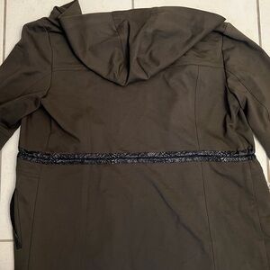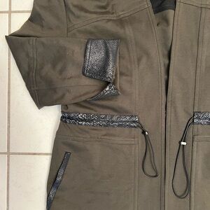 This legging-friendly jacket, crafted from 4-way stretch Ponte, offers meticulous construction and functionality. The Hibernation Hooded Parka showcases a functional sleeve phone pocket with zipper, side pockets, zip front, adjustable drawstring waist, and Faux Leather Black Snake trim for easy pairing. Inside it’s finished with contrast-color binding with the yoke lined in mesh for extra stretch. Showcase this hooded jacket over black leggings.