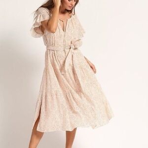 This elegant cream lace dress features delicate patterns and a flattering silhouette. Perfect for any occasion, it offers a timeless and sophisticated look.
