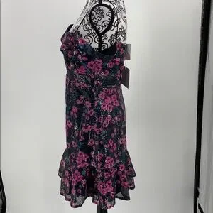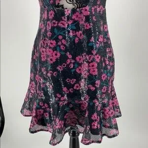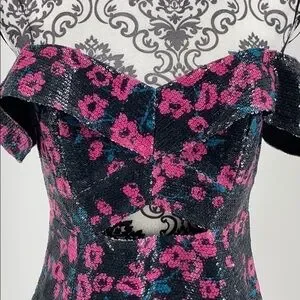 Sequined shoulder-baring mini with a peekaboo cutout and a flounced hem for a flirty look. Fits true to size. Concealed back zip with hook-and-eye closure, allover sequins, floral print, lined Approx. 27.5" from back of neck to hem Self: polyester; lining: polyester/spandex, dry clean.