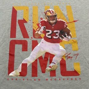 Soft cotton/poly blend for a soft feel on skin. Bold Christian McCaffrey image with Run CMC in logo. A must have for 49ers fans that want to support their superstar do it all back. Ideal for everyday wear.