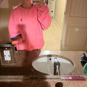 Vibrant pink sweatshirt. Features multicolor stripes on sleeves. Comfortable and stylish.