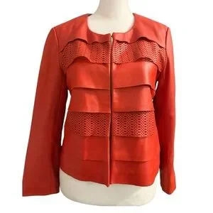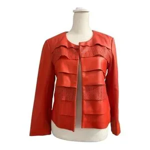 Vintage bagatelle women's cropped leather jacket in vibrant orange. Crafted from genuine leather, this preowned jacket offers a stylish layered design perfect for versatile wear.