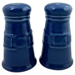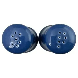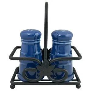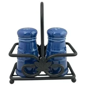 Keywords: salt shaker, pepper shaker, ceramic salt and pepper shakers, blue salt and pepper shakers, salt and pepper holder, metal salt and pepper holder, kitchen accessories, table setting, spice set, leaf design, decorative shakers
