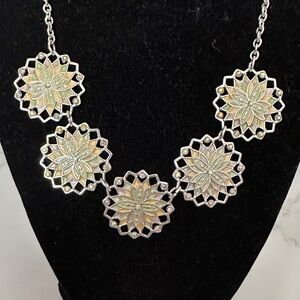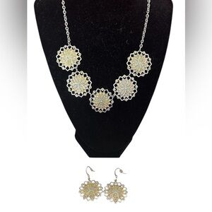 This is a statement earring and necklace set. It is a mix of gold and silver colors. They sort of resemble flowers.