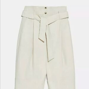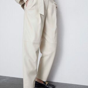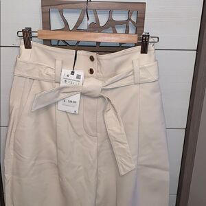 $229 NWT Zara Lesther pants. High waisted pants with petal detail. Tied self belt. Front zip and metal hook closure. Size small. ecru color. 100% lambskin leather. Lining is 100% polyester. Waist is 28”. Inseam is 28”