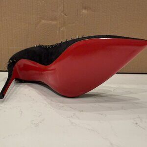 The Christian Louboutin Anjalina 100mm stiletto heels in size 42 feature a sleek black suede upper with a pointed toe design. These elegant pumps have a high stiletto heel measuring approximately 3.937 inches, adding a touch of sophistication to any outfit. The iconic red sole, gun metal spikes detailing, and classic pump style make these shoes a timeless and stylish choice for women who appreciate luxury footwear.