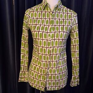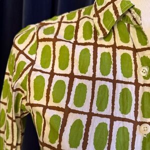 Elevate your style with this chic button down shirt featuring a vibrant green and brown pattern. Perfect for any occasion.