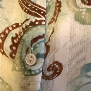 Elegant teal blouse with brown paisley design. Button-up front. Long sleeves. Perfect for casual or formal wear.