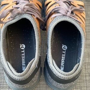 Stylish Merrell sneakers in gray and tan. Perfect for casual wear.