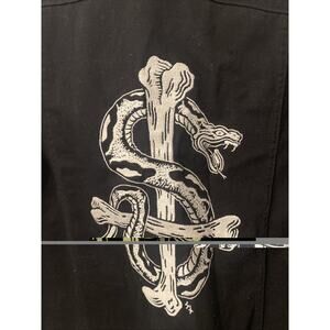 The Lurking Class Embroidered Black Denim Jacket in size small is a stylish and edgy outerwear option for men. Made of cotton denim with a vintage look, this short jacket features embroidered accents that add a unique touch. The black color and themes of snake, grunge, and gothic give it a distinctive style, perfect for casual, travel, or workwear occasions in the fall and winter seasons. With a regular fit and a brand known for quality, this jacket is a great addition to any wardrobe.