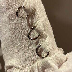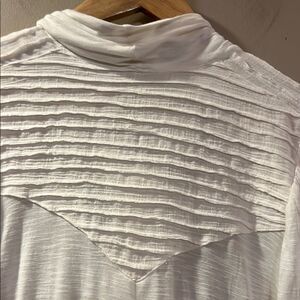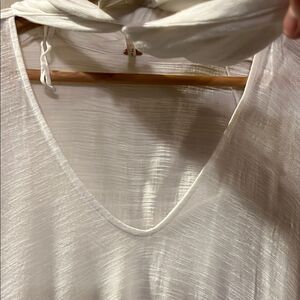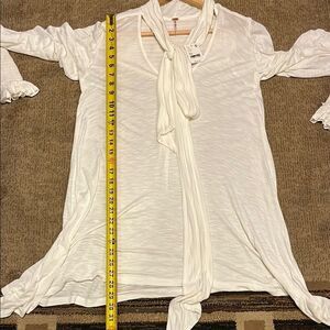 Chic and flowing design. Features a stylish tie at the neck. Perfect for layering or wearing alone. Metal embellishments on sleeves. New with tags, never worn. Sized as an XS but will fit much larger I think it’s mislabeled. Would fit a large, see measurements.