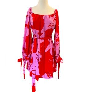 Red and pink floral dress. Features long sleeves, long tie cuffs, soft comfy fabric, and a flattering fit. Wear on or off the shoulder.