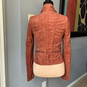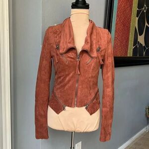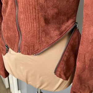 LIKE NEW condition. Super Soft Suede Fabric. lots of fun zippers. This chic moto jacket has a collared neckline, and long sleeves with zipper cuffs, all in super soft vegan suede. Gunmetal zippers provide a center opening at front, decorative pockets, and accents above the hem.
